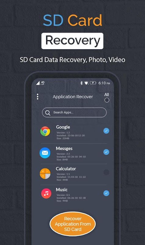 ⭐ এসডি কার্ড ডেটা রিকভারি, ফটো, ভিডিও এমন একটি শক্তিশালী অ্যাপ্লিকেশন যা আপনার ফোনে ইনস্টল থাকা সমস্ত অ্যাপ্লিকেশন এবং কয়েকটি অন্যান্য জিনিস ব্যাকআপ বা পুনরুদ্ধার করতে পারে। আপনি এটি কোনও এসডি কার্ড ডেটা পুনরুদ্ধারের মাধ্যমে করতে পারেন আপনার এমএমএস, এসএমএস, বুকমার্কস, কল লগস, সিস্টেম সেটিংস, অ্যালার্ম ক্লক, সমস্ত অ্যাক্সেস পয়েন্ট এবং অ্যাপ্লিকেশনগুলির ব্যাক আপ নেওয়া হয়েছে। গতি আপনার কাজটি খুব দ্রুত এবং সহজ সংরক্ষণ করুন, আপনি কেবল কয়েকটি বোতাম টিপুন, এটি কাজ শুরু করবে
