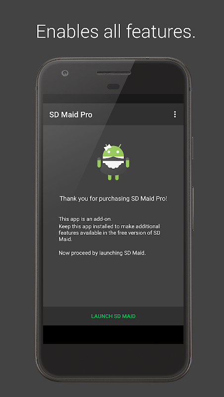 এই অ্যাপটি SD Maid এর ফ্রি সংস্করণের সব অতিরিক্ত বৈশিষ্ট্যগুলি চালু করে এবং "Pro" স্ট্যাটাস দেই।
