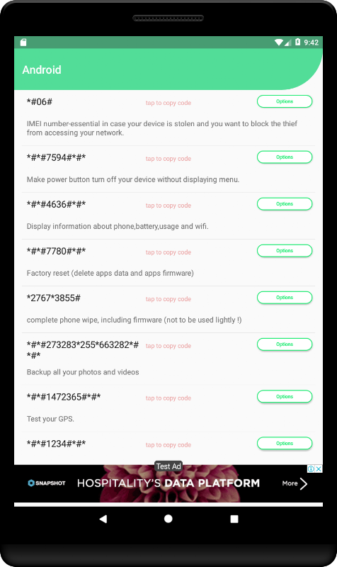 এই অ্যাপ্লিকেশন আপনার ডিভাইসের বিভিন্ন বৈশিষ্ট্যগুলির জন্য গোপন কোডগুলির তালিকা প্রদান করে।
