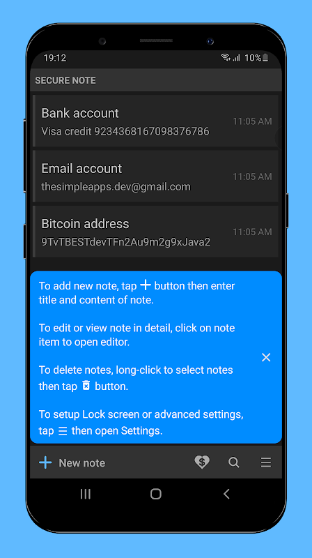 নোট লকার আপনাকে পাসওয়ার্ড, পিন বা প্যাটার্ন লক দ্বারা সুরক্ষিত নোট তৈরি এবং সম্পাদনা করতে দেয়।