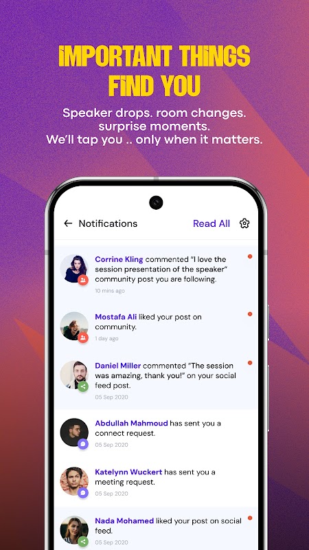 সময়সূচী পরিবর্তন, স্পিকার আপডেট এবং গুরুত্বপূর্ণ ঘোষণা সম্পর্কে রিয়েল-টাইম বিজ্ঞপ্তি পান, যাতে আপনি কখনই গুরুত্বপূর্ণ বিষয়গুলি মিস না করেন।