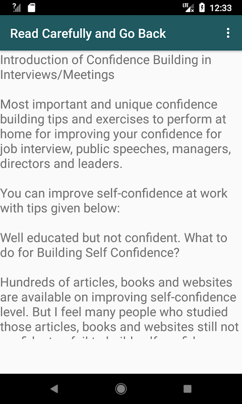 Reading and implementing the available confidence Exercises/tips in this app will help you to build and maintain your confidence level for any situation like job interviews, embassy interviews, visa interviews, business meetings, political meetings, sales meetings, conferences, workshops, training sessions, hosting, TV shows, events, gatherings etc.