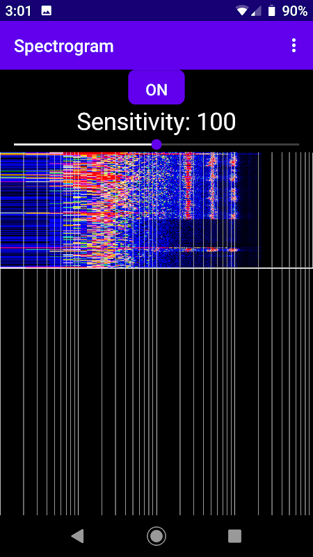এই বর্ণচিহ্নটি প্রতি 150 মিলিসেকেন্ডে 44,100 হার্টজের নমুনা হারে 1024 নমুনা সংগ্রহ করে। স্ক্রিনশটগুলিতে দেখানো 1024 নমুনার প্রতিটি সংগ্রহ ডিসপ্লেতে একটি একক অনুভূমিক রেখা অনুসারে।