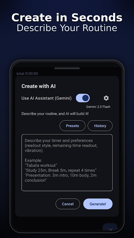 অধ্যয়ন সেশন, গভীর কাজ, ওয়ার্কআউট, রান্না এবং দৈনন্দিন অভ্যাসের জন্য টাইমার সিকোয়েন্স তৈরি করুন। রেডিমেড প্রিসেট দিয়ে দ্রুত শুরু করুন, অথবা লুপ, পজ স্টেপ, সাউন্ড এবং ভয়েস কিউ দিয়ে আপনার নিজস্ব ফ্লো তৈরি করুন।