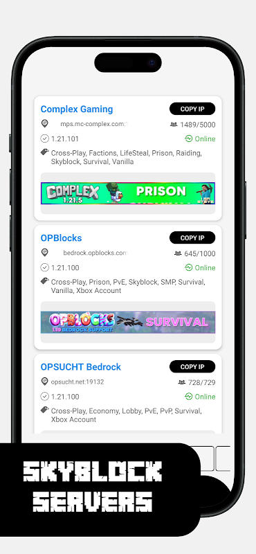 অ্যাপটি শুধুমাত্র সেই সার্ভারগুলি প্রদর্শন করে যা বর্তমানে অনলাইন এবং সক্রিয় রয়েছে। আপনি আপনার বেঁচে থাকার দক্ষতা পরীক্ষা করতে চান, সৃজনশীল ভূমিকা পালনকারী সম্প্রদায়গুলিতে যোগদান করতে চান বা PvP যুদ্ধে প্রতিদ্বন্দ্বিতা করতে চান না কেন, আপনি সর্বদা আপনার প্লেস্টাইলের সাথে মেলে এমন একটি সার্ভার পাবেন।