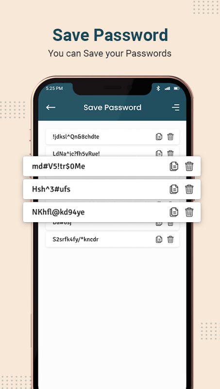 ব্যবহারকারী বিভিন্ন দৈর্ঘ্য সহ বর্ণমালা, চিহ্ন এবং সংখ্যা ব্যবহার করে এলোমেলো পাসওয়ার্ড তৈরি করতে পারে এবং পাসওয়ার্ড সংরক্ষণ করতে পারে।