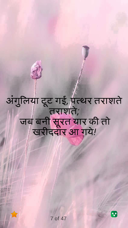 This app contains good collection of shayari in hindi language of different category like: Sad Shayari, life Shayari, mother Shayari, father, friendship Shayari,love Shayari, romantic shayri and many more in Hindi Shayari (Hindi) - शायरी