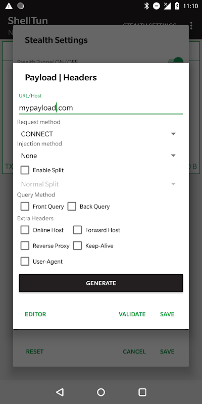 >> Open stealth setting, turn on stealth setting, edit http payload and select one of our server to connect or use your own custom server