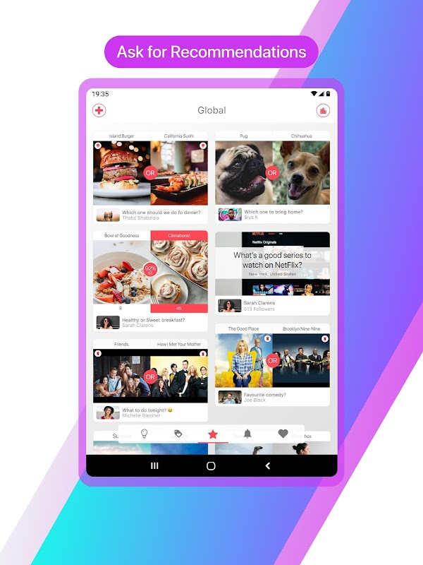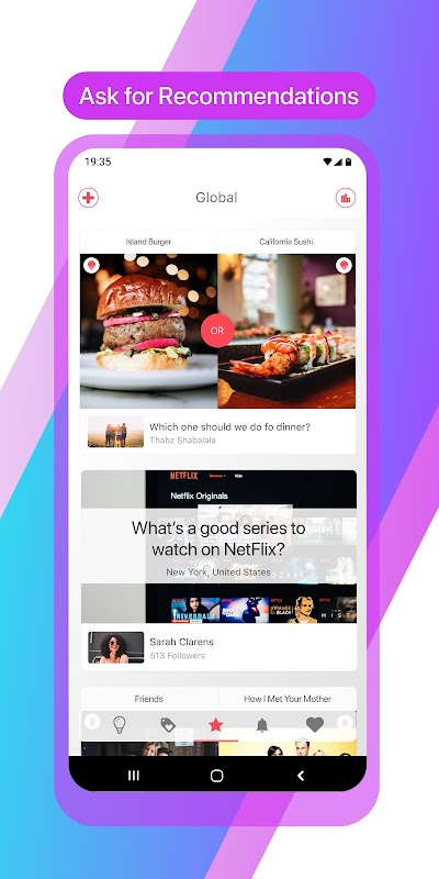* Ask for recommendations, see what your friends vote for.