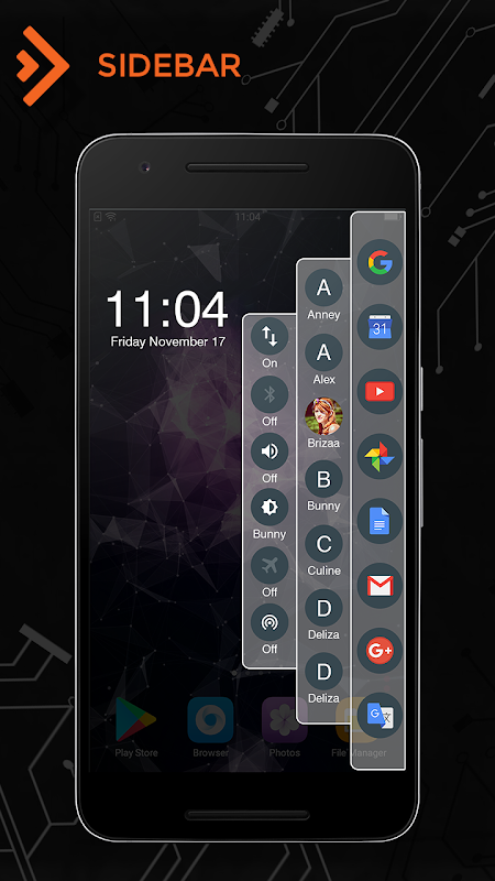 একটি ছোট কাজের জন্য সময় বর্তমান অ্যাপ্লিকেশান ছেড়ে না। সাইড বার অ্যাপ্লিকেশন যার দ্বারা আপনি একাধিক উইন্ডো ট্রে মধ্যে আপনার ইনস্টল করা অ্যাপ্লিকেশানগুলি আইকন এর শর্টকাট তৈরি করতে পারেন, দ্রুত সেটিংস, কল ব্যক্তি পরিবর্তন। এই পার্শ্বদন্ডে অ্যাপ্লিকেশন আপনি অঙ্গভঙ্গি দ্বারা এক হাতে আপনার ফোন ব্যবহার করার ক্ষমতা দেয়।