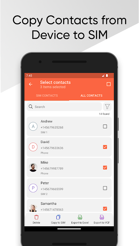 সিম কন্টাক্ট ম্যানেজার আপনাকে ডুয়াল সিম কন্টাক্ট ম্যানেজার সাপোর্টের মাধ্যমে আপনার সিম কার্ড এবং ডিভাইস মেমোরিতে সংরক্ষিত পরিচিতিগুলি সহজেই দেখতে, পরিচালনা করতে এবং সংগঠিত করতে দেয়।