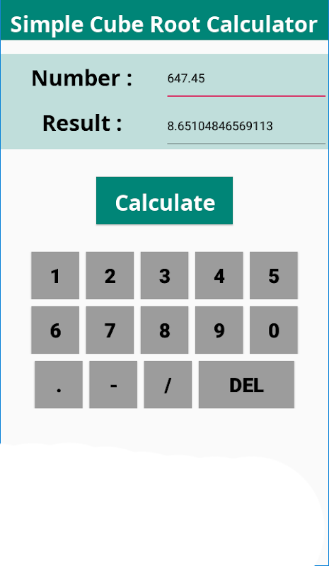এই বিনামূল্যে অ্যাপ্লিকেশন কোন সংখ্যার ঘন রুট গণনা করতে পারবেন। সংখ্যার সংখ্যা, দশমিক সংখ্যা, ভগ্নাংশ এবং নেতিবাচক সংখ্যা সমর্থিত।