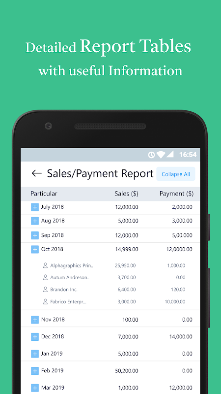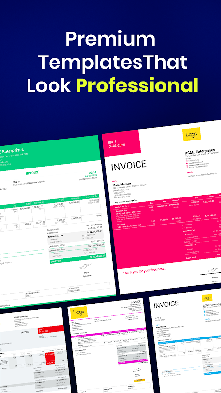 চালান উত্পন্ন করা সহজ এবং দ্রুত এবং আপনি তত্ক্ষণাত চালানগুলি তৈরি করতে এবং প্রেরণ করতে পারেন, অতিরিক্ত চালানগুলি ট্র্যাক করতে পারেন এবং সময় মতো আপনার চালানের জন্য অর্থ প্রদানের বিষয়টি নিশ্চিত করে নিতে পারেন।