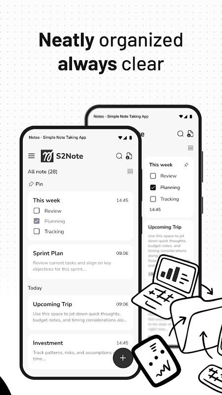 আপনি মিটিং নোটগুলি লিখে রাখছেন, ধারণাগুলি নিয়ে আলোচনা করছেন, ভ্রমণের পরিকল্পনা করছেন বা ব্যক্তিগত জার্নাল রাখছেন না কেন, এই নোট নেওয়ার অ্যাপটি আপনার কর্মপ্রবাহের সাথে খাপ খাইয়ে নেয়। দ্রুত এন্ট্রিগুলির জন্য এটি একটি সাধারণ নোটপ্যাড হিসাবে ব্যবহার করুন অথবা এটিকে দৈনন্দিন সময়সূচীর জন্য একটি পরিকল্পনাকারীতে রূপান্তর করুন। উৎপাদনশীল থাকার জন্য চেকলিস্ট যুক্ত করুন এবং দীর্ঘ চিন্তাভাবনা ক্যাপচার করার জন্য মেমো পৃষ্ঠাগুলি ব্যবহার করুন।