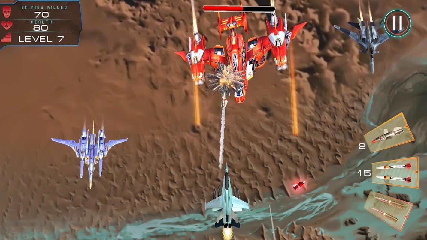 Gather your power and kick the living heck out of tyrannical autocrat's armadas in a series of breathtaking aerial battles. The enemy outnumbers you, but you're never alone – the unique game mode allows you to join forces. Shooting never ends. With a broad range of aircraft and upgrades to choose from, a variety of missions and challenges. There's absolutely no way you'll ever get bored. So be ready to attack. Choose the best guns and surprise the enemies with destructive missiles. Keep your strongest weapons reloaded to deliver a crucial strike to the enemies’ fighter jets. True bullet hell where metal melts.