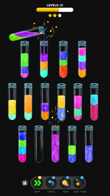 স্লাইম সাজানোর ধাঁধা খেলার আসক্তিপূর্ণ বিশ্বে স্বাগতম, চূড়ান্ত জল সাজানোর খেলা! রঙিন স্লাইমের রঙিন রাজ্যে নিজেকে নিমজ্জিত করুন এবং স্লাইম বাছাই করার চ্যালেঞ্জগুলির একটি মন্ত্রমুগ্ধ যাত্রা শুরু করুন। এর অনন্য গেমপ্লে এবং মনোমুগ্ধকর ভিজ্যুয়াল সহ, এই গেমটি আপনাকে ঘন্টার পর ঘন্টা বিনোদন দেবে নিশ্চিত। স্লাইম সাজানোর ধাঁধায়, আপনার উদ্দেশ্য হল রঙিন স্লাইমকে তাদের নিজ নিজ টিউবে সাজানো। প্রতিটি স্তর আপনাকে স্লাইম-ভরা টিউবগুলির একটি সেট দিয়ে উপস্থাপন করে এবং সেগুলিকে সঠিক ক্রমে পুনর্বিন্যাস করা আপনার উপর নির্ভর করে। একটি টিউব থেকে অন্য টিউবে স্লাইম ঢালা, প্রতিটি টিউবে শুধুমাত্র একটি রঙ রয়েছে তা নিশ্চিত করার জন্য আপনার চালগুলিকে কৌশলগত করুন।