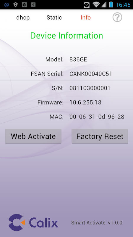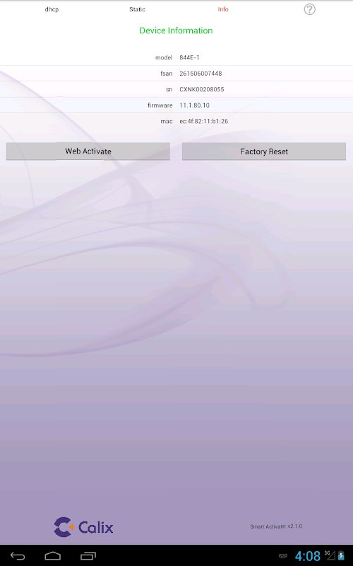 The Smart Activate apps designed to work with the Calix 7xx GE optical network terminals (ONTs) and 8xxGE residential services gateway (RSGs). Simply connect a local access point (AP) to the ONT / RSG, join the Wi-Fi network, and launch the app. The Smart Activate app will automatically find the 7xxGE ONT / 8xxGE RSG, allowing you to simply enter the registration ID and touch the activate button.