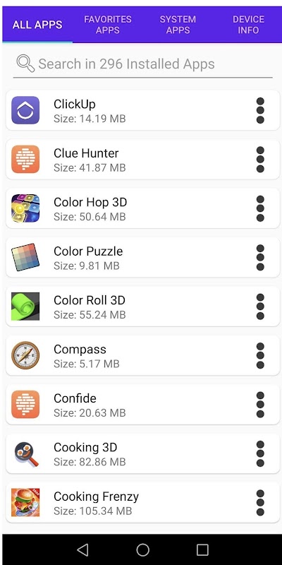 1. List All Apps: You can see all your installed apps in your phone. You can search the apps. Also you can open your apps, see details of the app, can uninstall the app with just a single click, can open playstore link, also you can share the app with others.