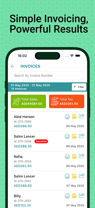 ওয়ান-ট্যাপ শেয়ারিং এবং প্রিন্টিং: হোয়াটসঅ্যাপ এবং অন্যান্য প্ল্যাটফর্মের মাধ্যমে সহজেই পেশাদার চেহারার চালান শেয়ার করুন বা ইন্টিগ্রেটেড প্রিন্ট বিকল্পের সাথে হার্ড কপি তৈরি করুন।
