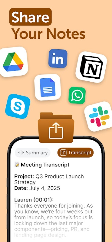 আপনার ভয়েস নোটগুলি সংগঠিত রাখুন। স্মার্ট নোটার একটি শক্তিশালী নোট সংগঠক যা আপনার রেকর্ডিংগুলিকে শ্রেণীবদ্ধ করে। আপনার প্রতিলিপি করা বক্তৃতা PDF, TXT, অথবা SRF ফাইল হিসাবে রপ্তানি করুন। মিটিং নোট সরাসরি সহকর্মীদের সাথে শেয়ার করুন অথবা আপনার পছন্দের উৎপাদনশীলতা সরঞ্জামগুলির সাথে সিঙ্ক করুন।