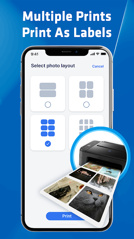 আপনার গ্যালারি বা ক্যামেরা থেকে ফটোগুলি নির্বাচন করুন এবং সঠিক রঙ এবং ক্রপিং সহ সম্পূর্ণ রেজোলিউশনে মুদ্রণ করুন।