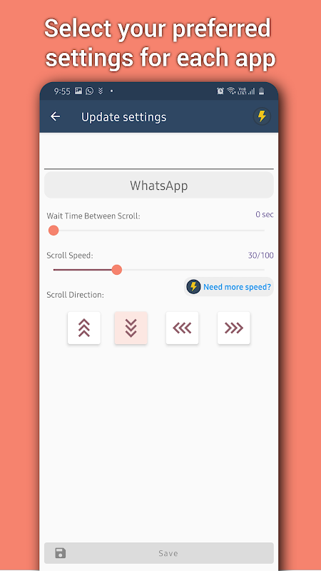 অটোমেশন বৈশিষ্ট্য আপনাকে নির্দিষ্ট সময়ের জন্য আপনার পছন্দের প্রয়োগের জন্য স্ক্রোলিং গতি এবং দিকনির্ধারণ এবং ক্রিয়াটি স্বয়ংক্রিয়ভাবে পুনরাবৃত্তি করতে অনুমতি দেবে।