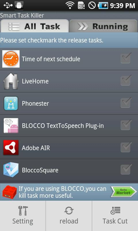 Smart Task Killer is a tool to kill running tasks and running apps that you selected.It will speed up and save battery for your device.