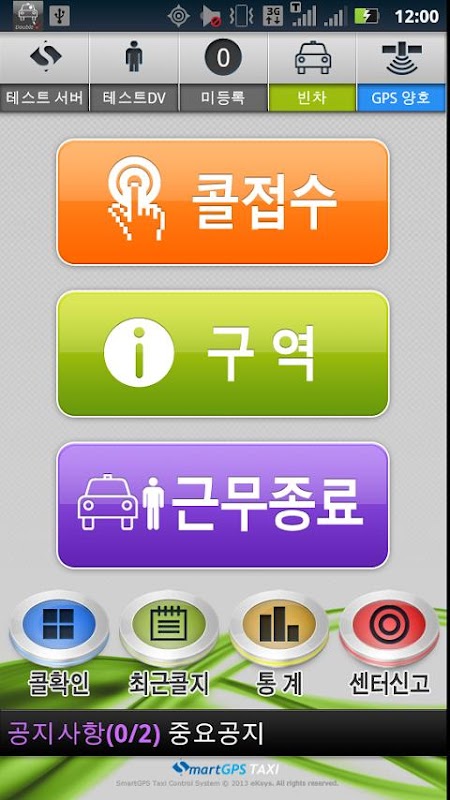 차량 외부에서 언제 어디서나 손쉽게 근무시작, 콜접수, 콜확인, 자동배차, 배차성공 수신, 구역설정, 통계, 신고 등의 서비스를 이용할 수 있습니다.