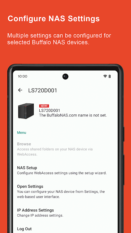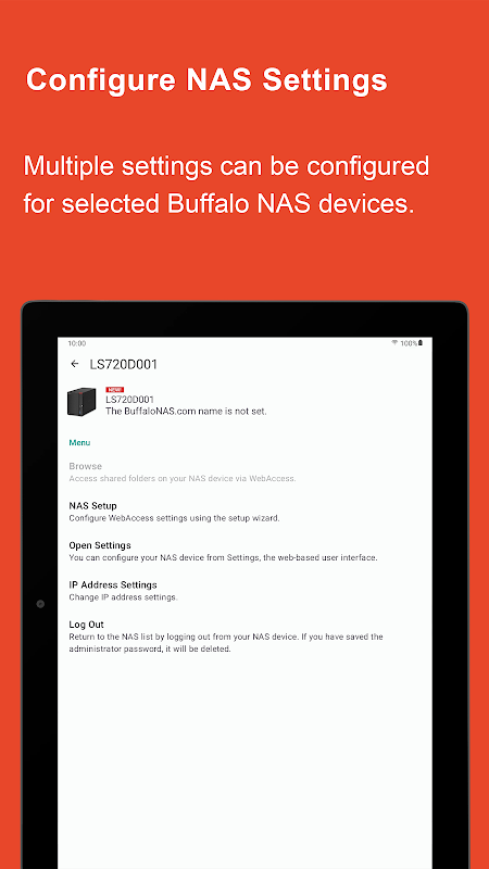 স্মার্টফোন ন্যাভিগেটর আপনাকে এমন একটি নেটওয়ার্কে বাফেলো এনএএস ডিভাইসগুলি (লিঙ্কস্টেশন এবং টেরাস্টেশন) অনুসন্ধান করতে দেয় যার সাথে মোবাইল ডিভাইসটিও সংযুক্ত রয়েছে৷ আপনি আপনার মোবাইল ডিভাইস থেকে শনাক্ত করা Buffalo NAS ডিভাইসগুলি পরিচালনা করতে অ্যাপটি ব্যবহার করতে পারেন।