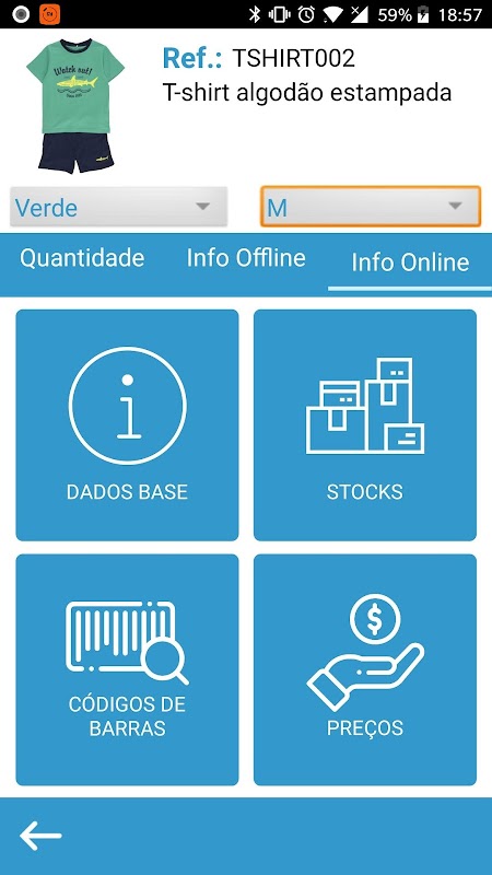 Aplicação permite efetuar consultas de informação sobre o produto, online e offline, como preços, stocks (inclusive por cor e tamanho ou propriedade).