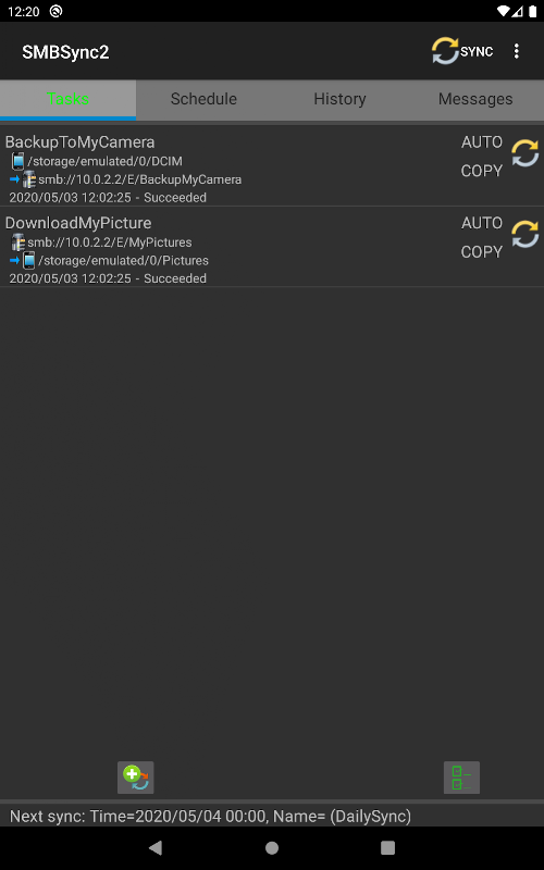 এসএমবিএসসিএন 2 একটি অ্যান্ড্রয়েড টার্মিনাল, এসডিকার্ড এবং পিসি / এনএএস এর অভ্যন্তরীণ স্টোরেজের মধ্যে এসএমবি 1, এসএমবি 2 বা এসএমবি 3 প্রোটোকল ব্যবহার করে ওয়্যারলেস ল্যানের মাধ্যমে ফাইলগুলি সিঙ্ক্রোনাইজ করার একটি সরঞ্জাম। সিঙ্ক্রোনাইজেশন হ'ল মাস্টার থেকে লক্ষ্য, আয়না, সরানো, অনুলিপি, সংরক্ষণাগার ব্যবহারের একমুখী। (অভ্যন্তরীণ স্টোরেজ, এসডিকার্ড, এসএমবি, জিপ সংমিশ্রণ সম্ভব)