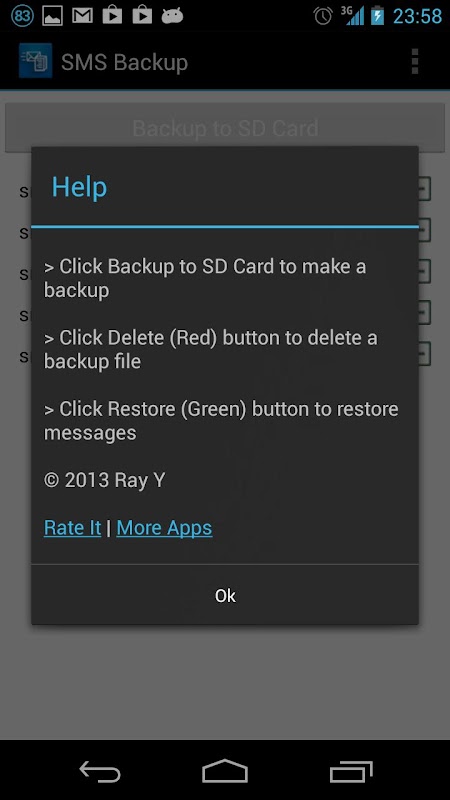 This application lets you backup your SMS onto SD Card and restore from it. No Ads, clean and free, simple to use.