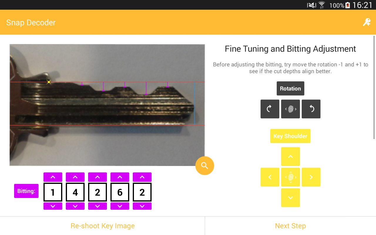 স্ন্যাপ সঙ্কেতমোচক মালিকানা কী প্রান্ত সনাক্তকরণ আলগোরিদিম সঙ্গে প্রোগ্রাম হয়. আপনার ছবির একটি প্লেইন, সাদা পটভূমিতে এবং ফোকাস হয়, অ্যাপ্লিকেশন কি সব বৈশিষ্ট্য সনাক্ত এবং কয়েক সেকেন্ডের মধ্যে bitting গণনা করা হবে.