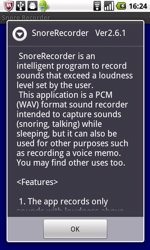 এই অ্যাপ্লিকেশনটি ঘুমের সময় (, snoring কথা) শব্দ ক্যাপচার উদ্দেশ্যে একটি PCM (WAV) বিন্যাসে সাউন্ড রেকর্ডার, কিন্তু এটি যেমন একটি ভয়েস মেমো রেকর্ড হিসাবে অন্যান্য কাজের জন্য ব্যবহার করা যেতে পারে.