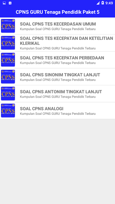 2020-এ শিক্ষকদের শিক্ষকদের জন্য সিপিএনএসের প্রশ্ন অ্যাপ্লিকেশন হ'ল ডিজিটাল লার্নিং মিডিয়া হ'ল সম্ভাব্য সিভিল কর্মচারীদের জন্য যারা পরীক্ষা নির্বাচন করবেন যাতে তারা শিক্ষক সিপিএনএস 2020 পরীক্ষায় সিএটি শিক্ষকদের মুখোমুখি হওয়ার জন্য আরও প্রস্তুত থাকে।
