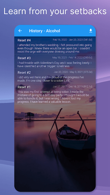 সংযম অনুপ্রেরণা এবং সমর্থন প্রয়োজন. আপনি প্রতিদিনের বার্তা, লক্ষ্য এবং আপনার সংযম পাল্টা টিক দেখার মাধ্যমে অনুপ্রাণিত থাকবেন। আমাদের শান্ত সম্প্রদায় মানুষের সংযোগ প্রদান করে, যা আপনাকে তাদের শান্ত ঘড়িতে বছরের পর বছর বা এমনকি কয়েক দশকের লোকেদের থেকে ভাগ করে নিতে এবং শিখতে দেয়।