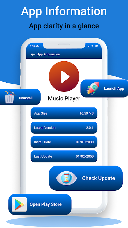 আপডেট সফ্টওয়্যার অ্যাপ আপডেটগুলি পরীক্ষা করার জন্য প্লে স্টোরে অ্যাপ আপডেট অ্যাক্সেস করার একটি সহজ উপায়। সফ্টওয়্যার আপগ্রেডারের মাধ্যমে ব্যবহারকারীরা Wi-Fi IP ঠিকানা এবং আরও অনেক বিশদ যেমন ট্রান্সমিট লিংক স্পিড ইত্যাদি জানতে পারে। আপডেট চেকার, ব্যবহারকারীদের ইনস্টল করা অ্যাপ এবং সিস্টেম অ্যাপগুলি আলাদাভাবে দেখতে সাহায্য করে। ডিভাইসের তথ্যে, ব্যবহারকারী ফোন আপডেটারের মাধ্যমে ডিভাইসের নাম, মডেল, সংস্করণ ইত্যাদি পেতে পারেন।