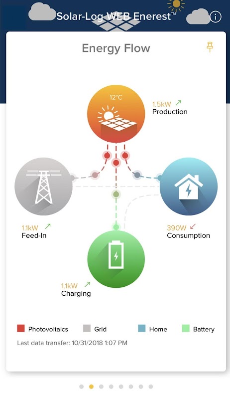 অ্যাপটি সংক্ষিপ্তভাবে উত্পাদন, ফিড-ইন, স্ব-খরচ এবং অনাবৃত কেডাব্লুএফ উপস্থাপন করে। এই মানগুলি একটি সারণী তালিকা হিসাবেও উপলব্ধ। বর্তমান এবং historicalতিহাসিক উদ্ভিদের ডেটা পাশাপাশি সংযুক্ত উপাদানগুলি (উদাহরণস্বরূপ হিটার বা হিটার পাম্প) ভিজ্যুয়ালাইজ করা যায়।
