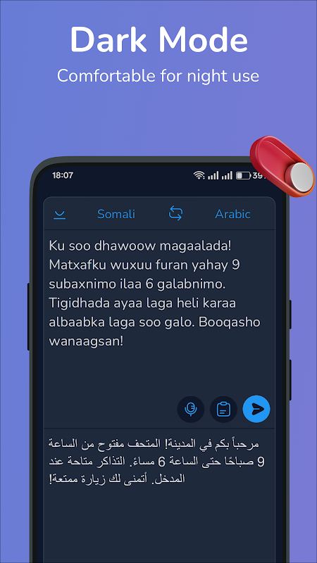 - প্রাকৃতিক বক্তৃতা স্বীকৃতি: শুধু স্বাভাবিকভাবে কথা বলুন এবং আরবি বা সোমালি ভাষায় নিখুঁত অনুবাদ পান