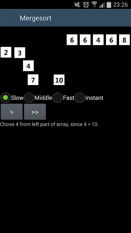 For every algorithm you can see the animated sorting procedure which makes it easy to understand.