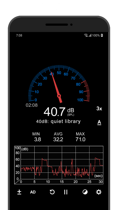বেশিরভাগ অ্যান্ড্রয়েড ডিভাইসগুলিতে মাইক্রোফোনগুলি মানুষের ভয়েস সংযোজিত হয়। সর্বাধিক মান ডিভাইস দ্বারা সীমাবদ্ধ। খুব জোরে শব্দ (বেশি ~ 90 ডিবি) বেশিরভাগ ডিভাইসে স্বীকৃত হতে পারে না। সুতরাং এটি শুধুমাত্র একটি সহায়ক সরঞ্জাম হিসাবে ব্যবহার করুন। যদি আপনার আরো সঠিক ডিবি মানের প্রয়োজন হয় তবে আমরা তার জন্য একটি প্রকৃত শব্দ স্তর মিটার সুপারিশ করি।