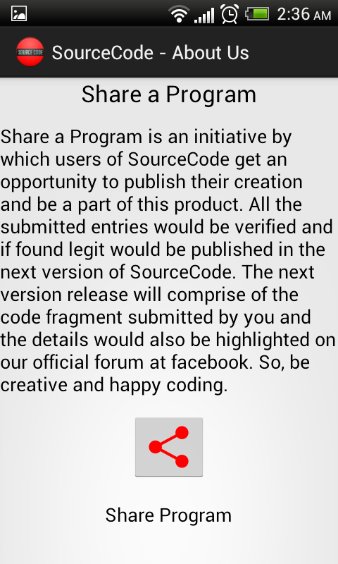 Share a Program is an initiative by which users of SourceCode get an opportunity to publish their creation and be a part of this product. All the submitted entries would be verified and if found legit would be published in the next version of SourceCode. The next version release will comprise of the code fragment submitted by you and the details would also be highlighted on our official forum at Facebook. So, be creative and happy coding. And dont forget to find your submissions on our Facebook Page.