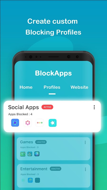 এই অ্যাপ ব্লকার এবং স্প্যাম ওয়েবসাইট ব্লকার ব্যবহার করে ব্যবহারকারী একাধিক অ্যাপকে প্রোফাইলে যুক্ত করে ব্লক করতে পারেন। ব্যবহারকারীরা সোশ্যাল মিডিয়া, ফিনান্স, গেমস ইত্যাদির মতো অ্যাপ বিভাগের উপর ভিত্তি করে নির্দিষ্ট প্রোফাইল তৈরি করতে পারে।