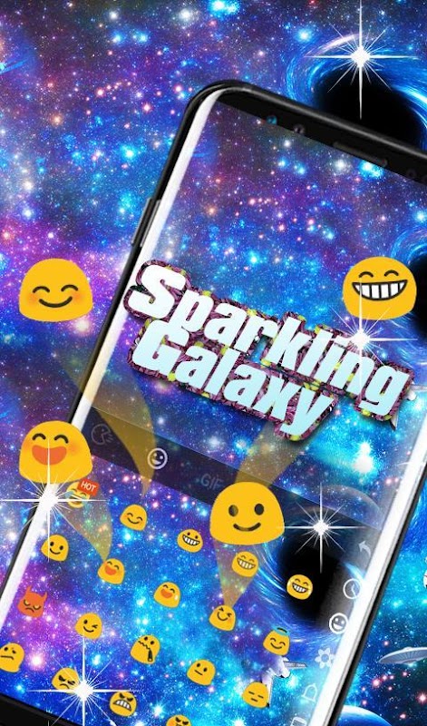 Free download of Sparkling Galaxy emoji keyboard theme with glitter background.