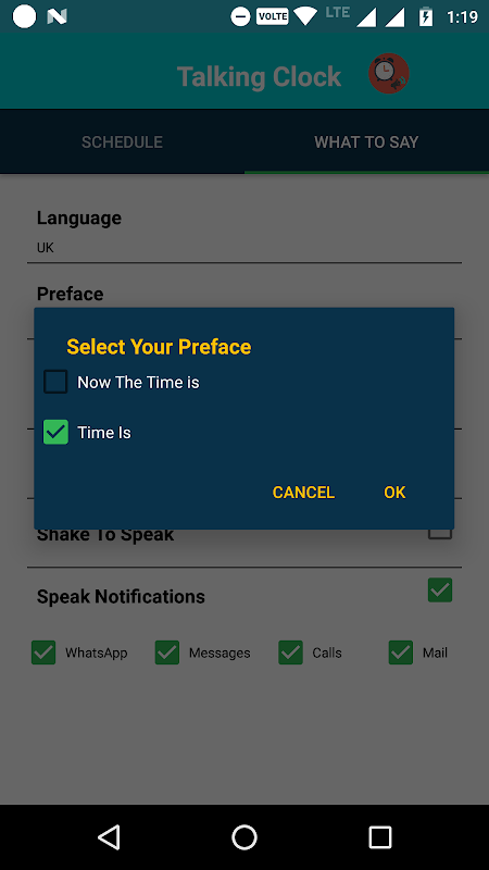 1.Enjoy automatic time announcements at regular intervals. Say the Time can tell you the time every minute, 5 minutes, 10 minutes, 15 minutes, 20 minutes, half hour, or hour. 2.Set a snooze period to turn off time announcements between specific hours. That way you won't be bothered when you're asleep! 3.Customize the spoken announcement. Hear the time in 12 hour, 24 hour. 4.Set the particular week days to say the clock. 5.Set your preface to speak text of the clock 6.Shake to tell the current system time. 7.set your volume for speaking text 8.You will get the Notification for the say the time is in ON and also if you want stop the speaking you will stop the notification bar. 9.for shortcut we developed the widget for this app.