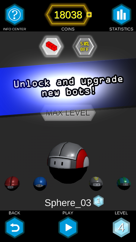 আপনি গেমটিতে অগ্রসর হওয়ার সাথে সাথে আপনি 12টি স্ফিয়ারবট কিনতে এবং আপগ্রেড করতে সমস্ত অর্জিত কয়েন ব্যয় করতে পারেন। প্রতিটি চরিত্রের একটি আলাদা দক্ষতা সেট আছে। আপনার জন্য সেরা যেটি আবিষ্কার করুন এবং মজা করুন!
