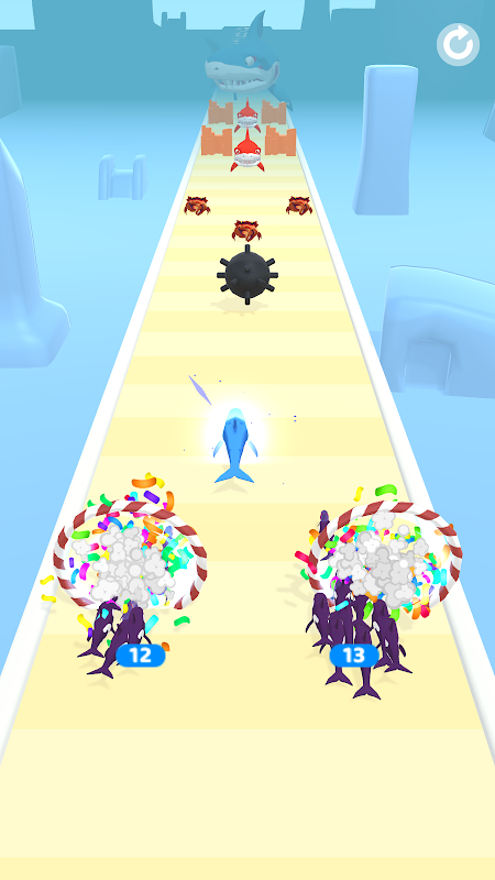 শত্রু এবং ফাঁদ এড়াতে আপনার মাছের স্ট্যাকে বিভক্ত করুন বা যোগ দিন! হাঙ্গর যুদ্ধ!