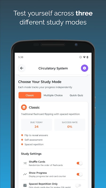 - ক্লাসিক ফ্ল্যাশকার্ডস: কার্যকর মুখস্থ করার জন্য ঐতিহ্যগত ব্যবধানের পুনরাবৃত্তি