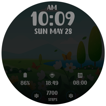 বসন্ত ল্যান্ডস্কেপ চিত্র সহ ডিজিটাল ওয়াচফেস। Wear OS স্মার্টওয়াচের জন্য।