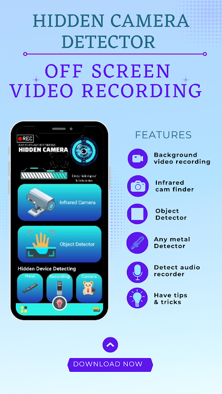 এর ক্ষমতা ছাড়াও, আমরা একটি নতুন বৈশিষ্ট্য প্রবর্তন করছি: অফ-স্ক্রিন রেকর্ডিং। স্ক্রিন রেকর্ডিংয়ের মতো ডিজিটাল ক্রিয়াকলাপগুলিকে অন্তর্ভুক্ত করার জন্য গোপনীয়তার আক্রমণটি শারীরিক ক্যামেরার বাইরেও প্রসারিত হয়। হিডেন ক্যামেরা ডিটেক্টরের মধ্যে এই বর্ধিত কার্যকারিতা: স্পাই ক্যাম ফাইন্ডার আপনাকে শারীরিক লুকানো ক্যামেরা সনাক্ত করতে এবং আপনার স্মার্টফোনে স্ক্রীন কার্যকলাপগুলিকে বিচক্ষণতার সাথে রেকর্ড করার ক্ষমতা দেয়।
